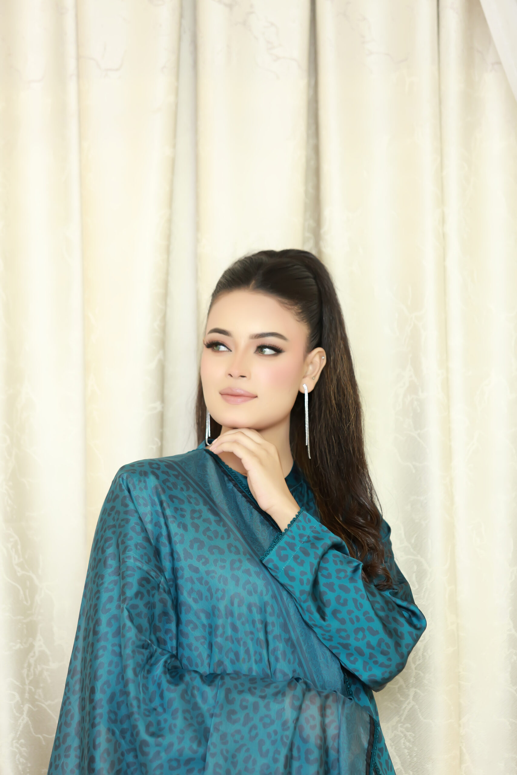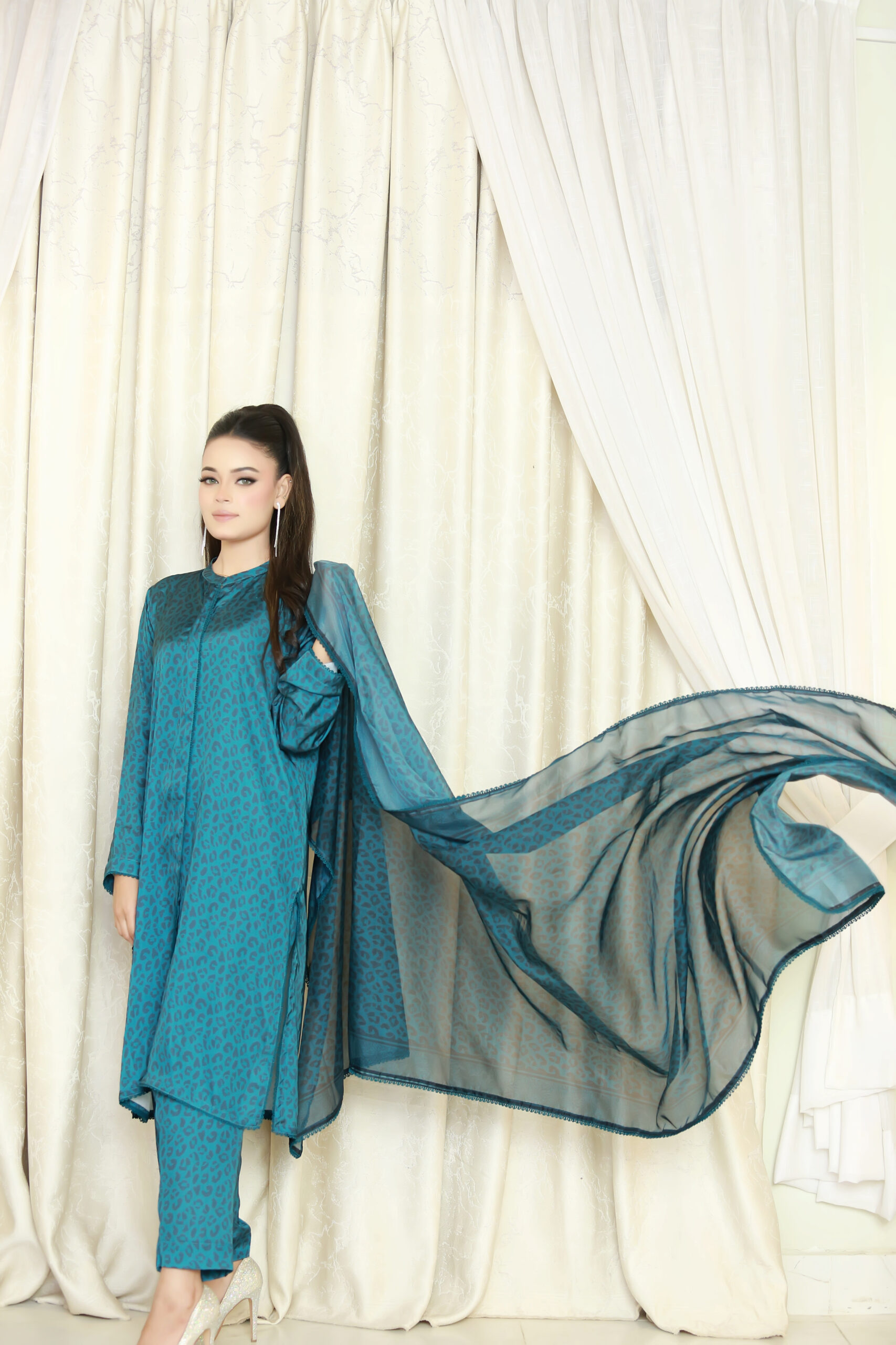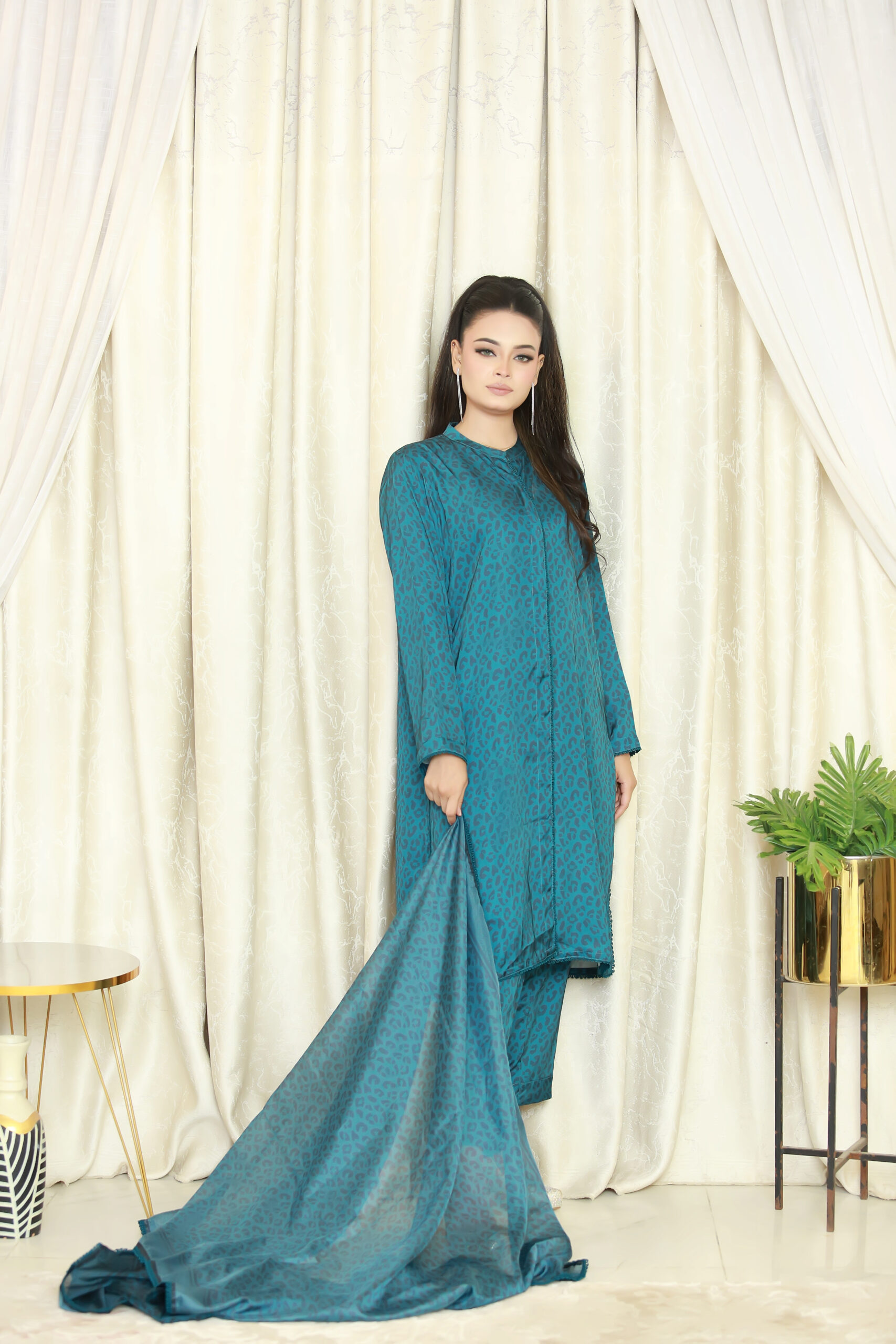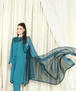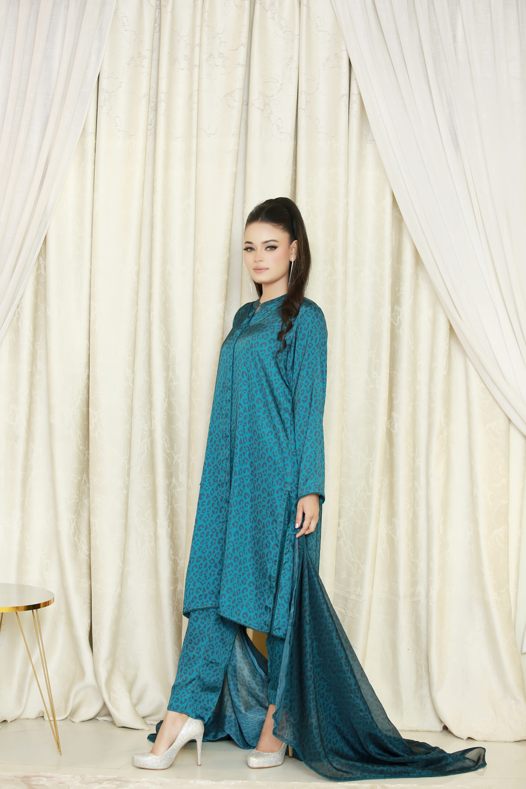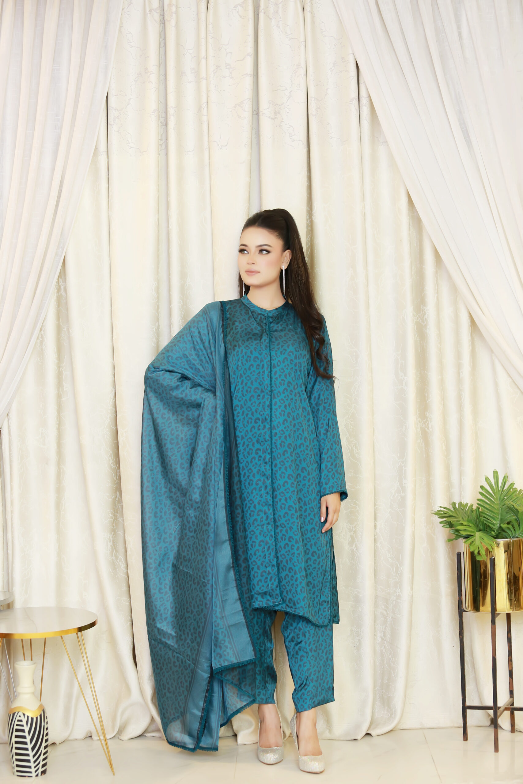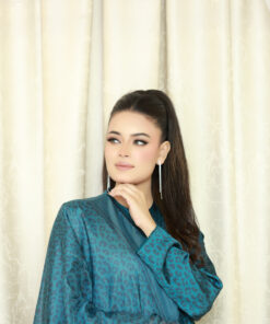 A chic blue silk 3-piece suit with animal print front-open shirt, straight-cut pants, and coordinating lightweight dupatta. Perfect for festive, formal, and standout occasions across the UK.