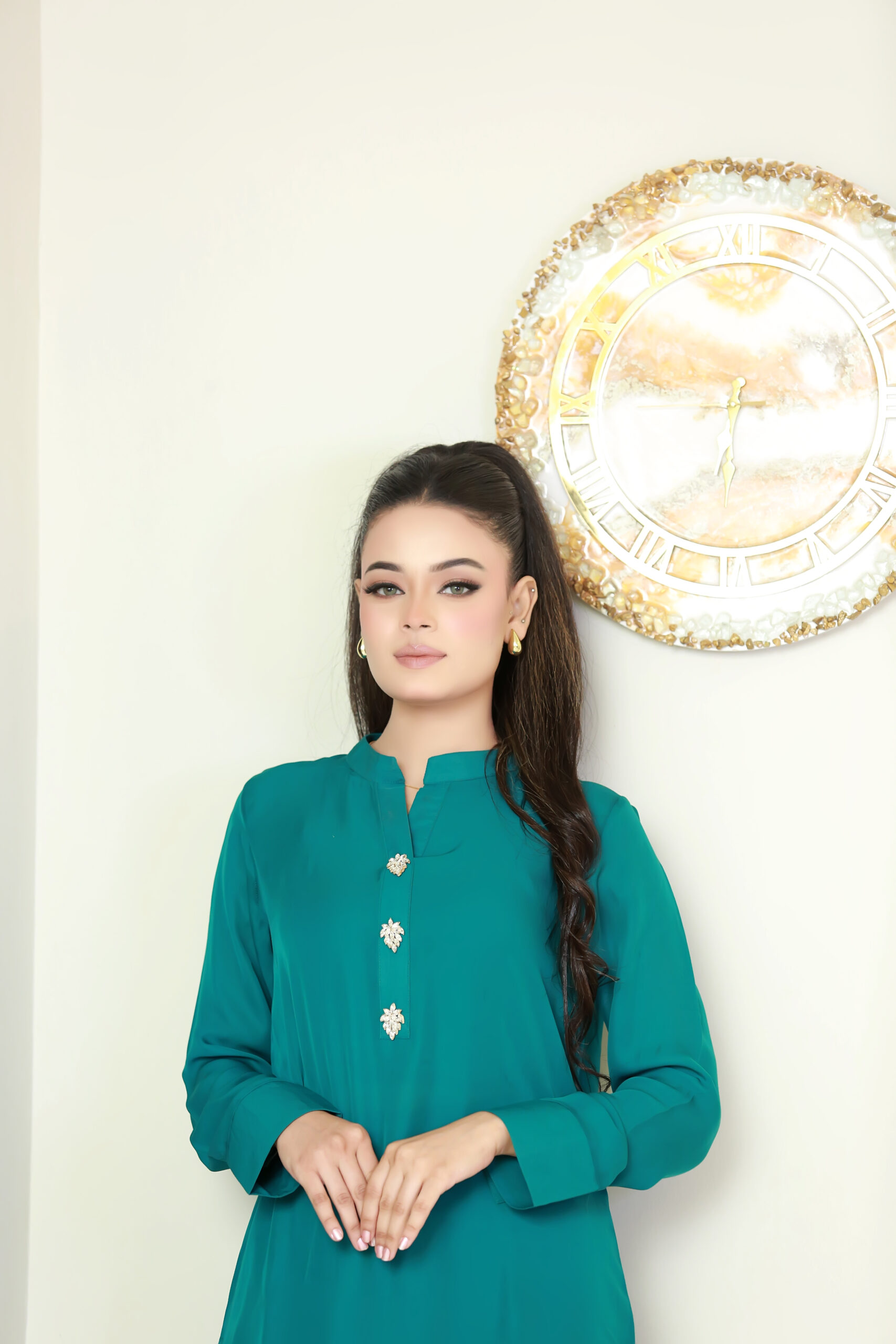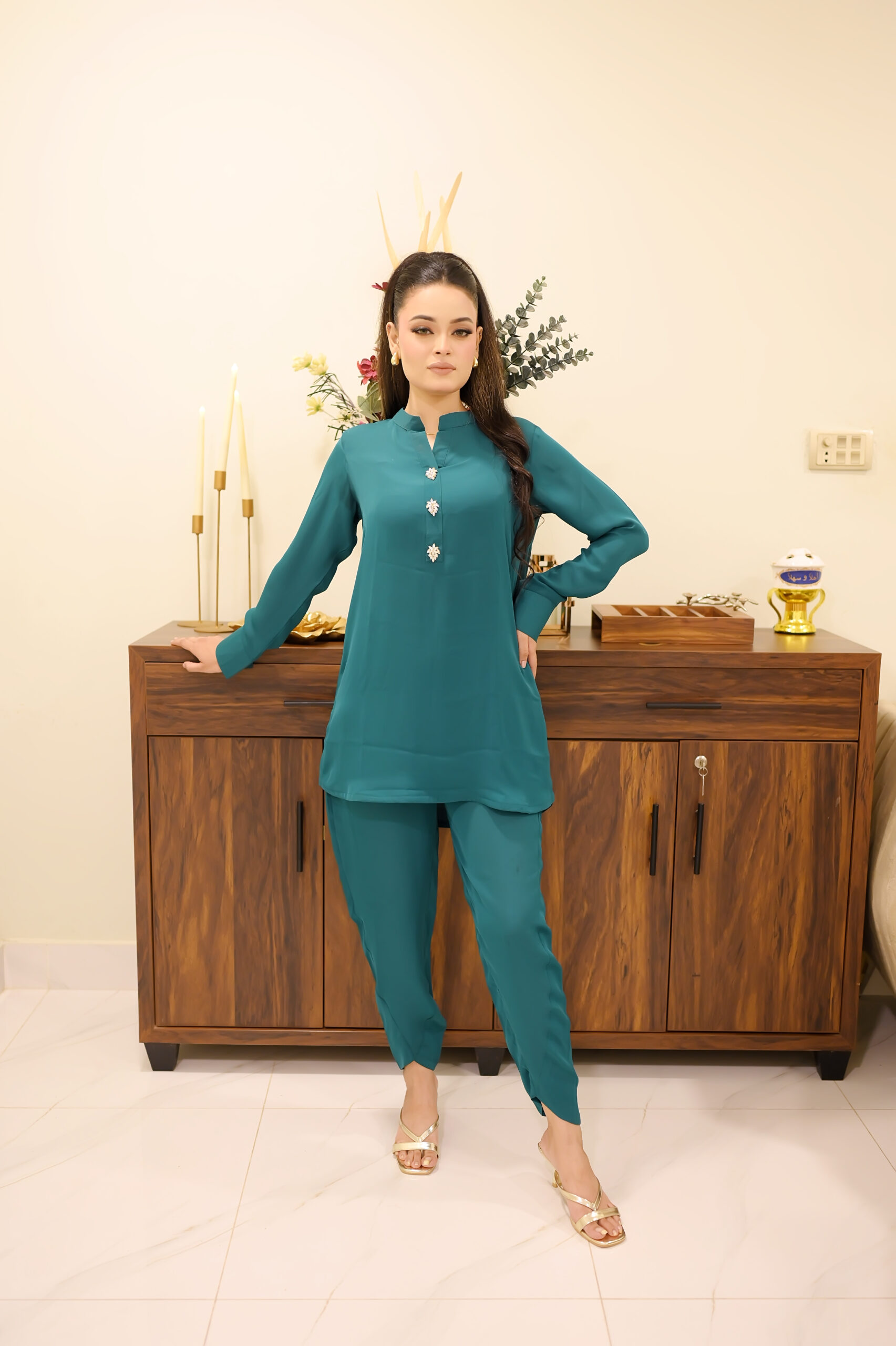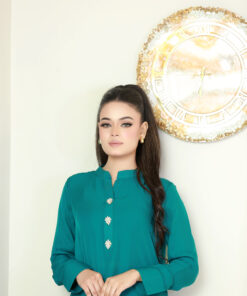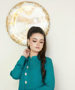 The outfit features a green kurta adorned with white front buttons, paired with matching trousers and a lightly colorful dupatta to complete the ensemble. The soft fabric and intricate finishing make it ideal for festive celebrations, formal events, and casual gatherings across London, Manchester, and the UK. This versatile suit combines traditional charm with contemporary design, ensuring a polished, stylish look for every occasion.