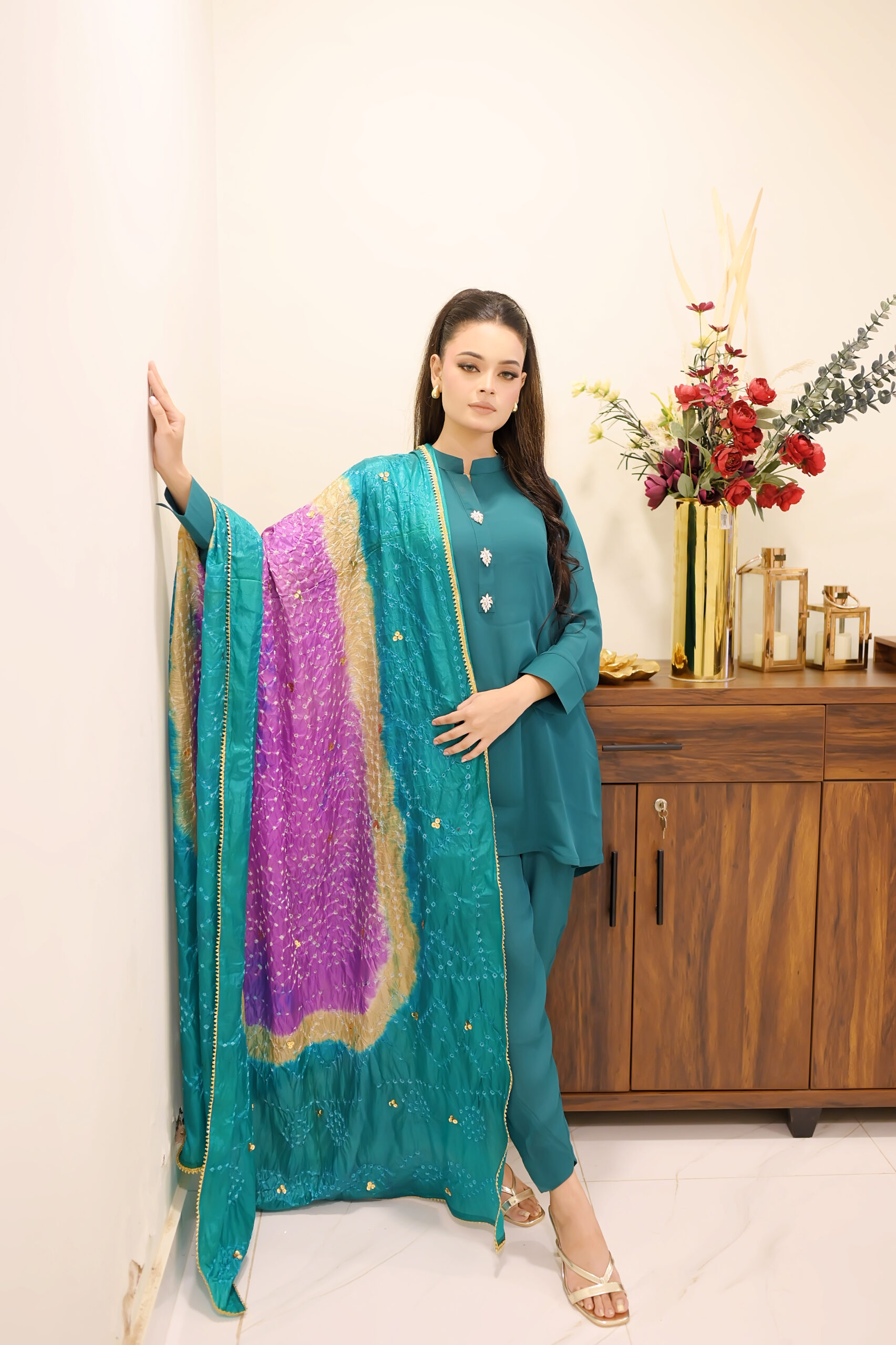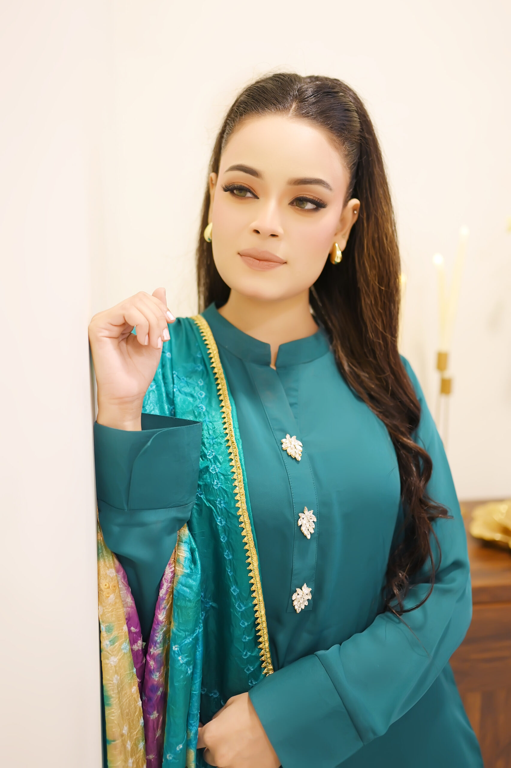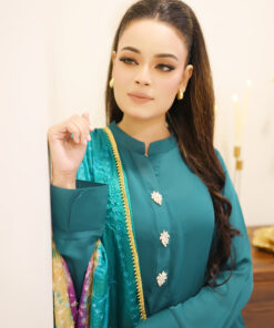 A luxurious green 3-piece suit featuring white front buttons, paired with a soft, colorful dupatta. Perfect for festive, formal, and casual gatherings across the UK.