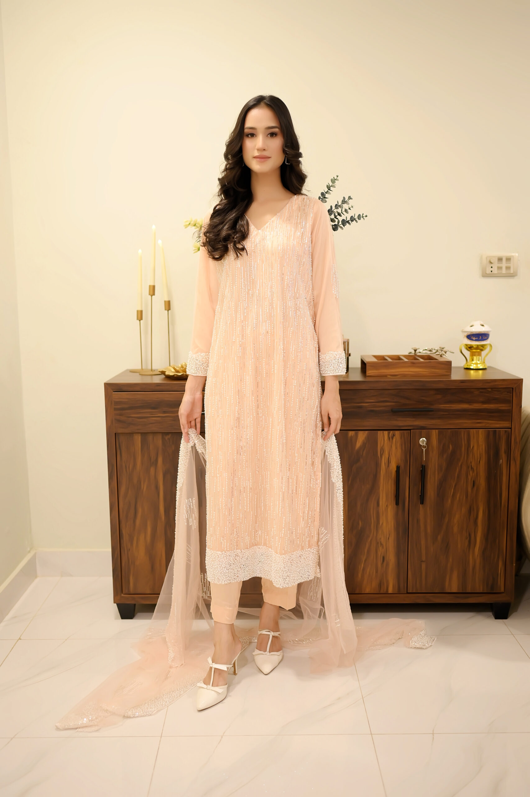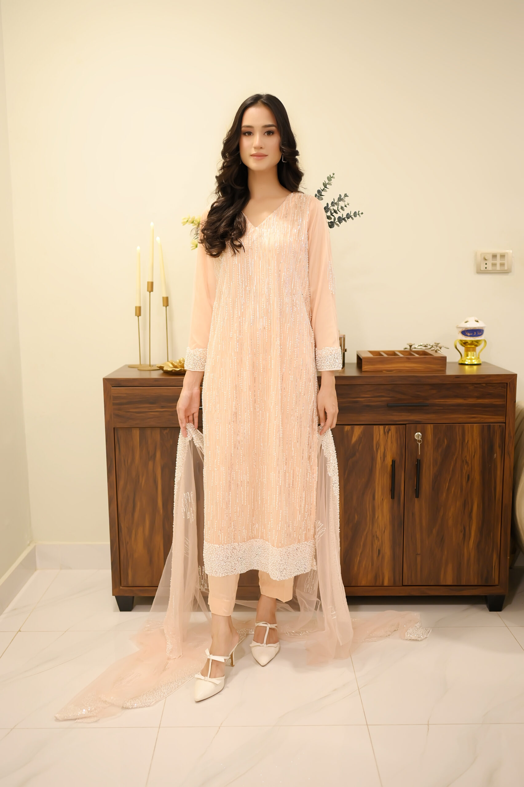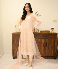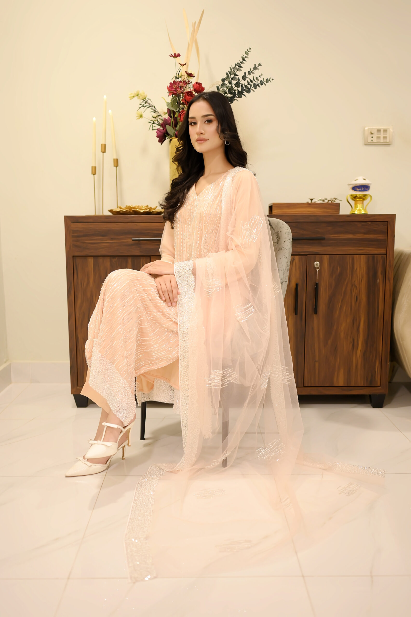 This ensemble features intricate beadwork on delicate net fabric, complemented by a matching lining and dupatta for a complete, elegant look. Ideal for weddings, formal occasions, and grand celebrations across London, Manchester, and the UK, Eternal Elegance exudes luxury while maintaining a classic, graceful silhouette. Pair with subtle accessories to let the exquisite detailing shine.