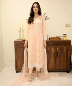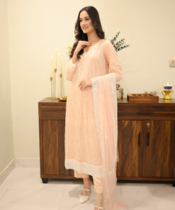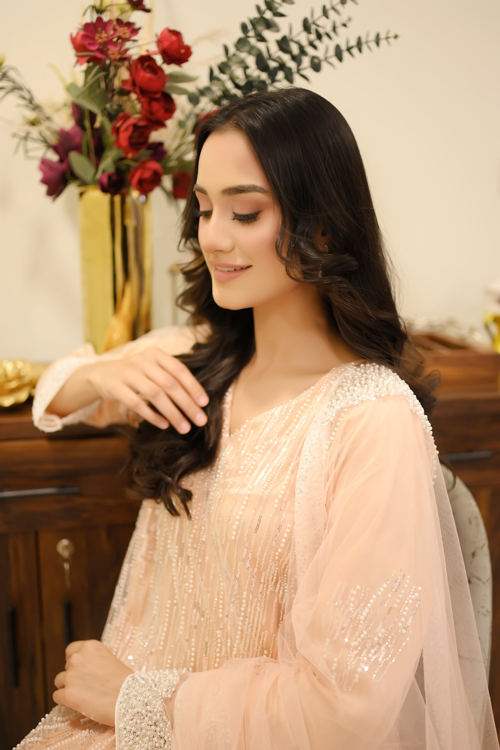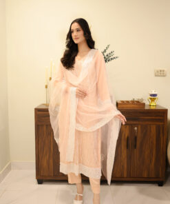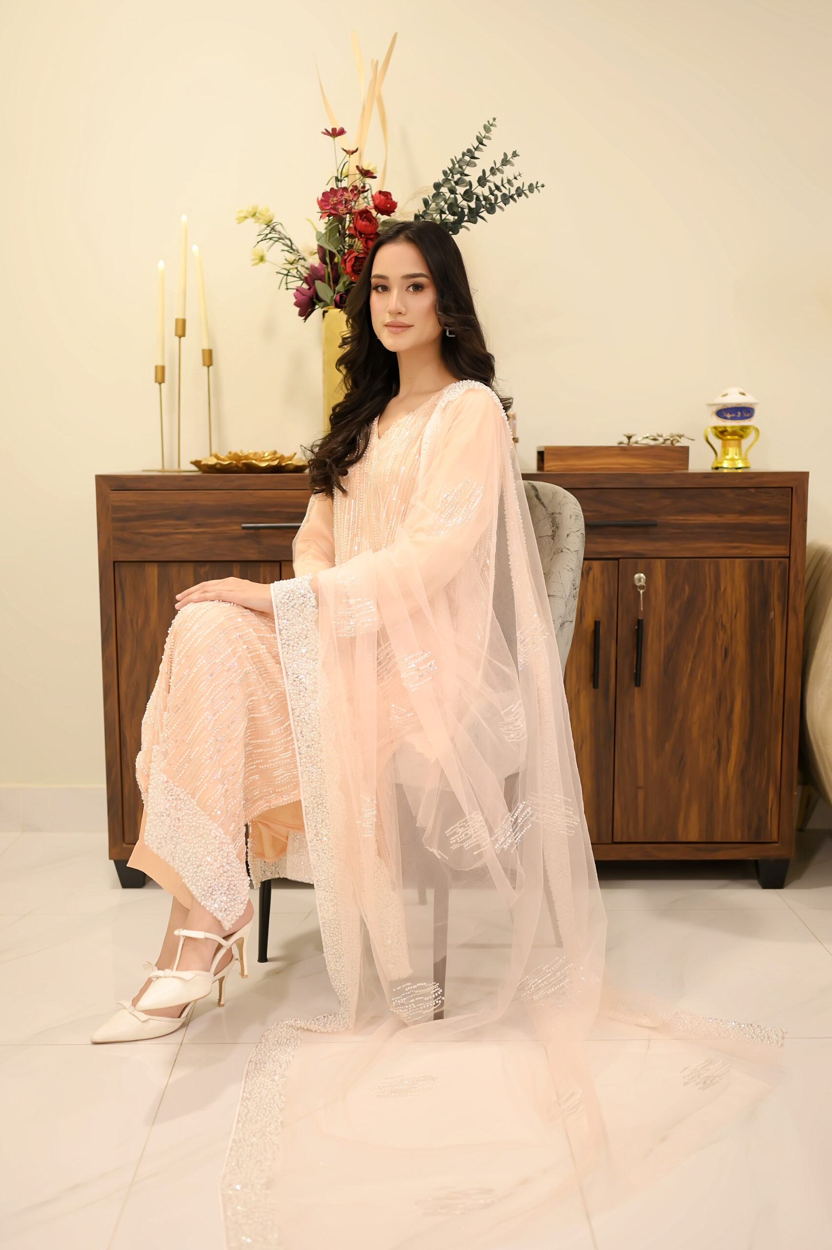 This ensemble features intricate beadwork on delicate net fabric, complemented by a matching lining and dupatta for a complete, elegant look. Ideal for weddings, formal occasions, and grand celebrations across London, Manchester, and the UK, Eternal Elegance exudes luxury while maintaining a classic, graceful silhouette. Pair with subtle accessories to let the exquisite detailing shine.