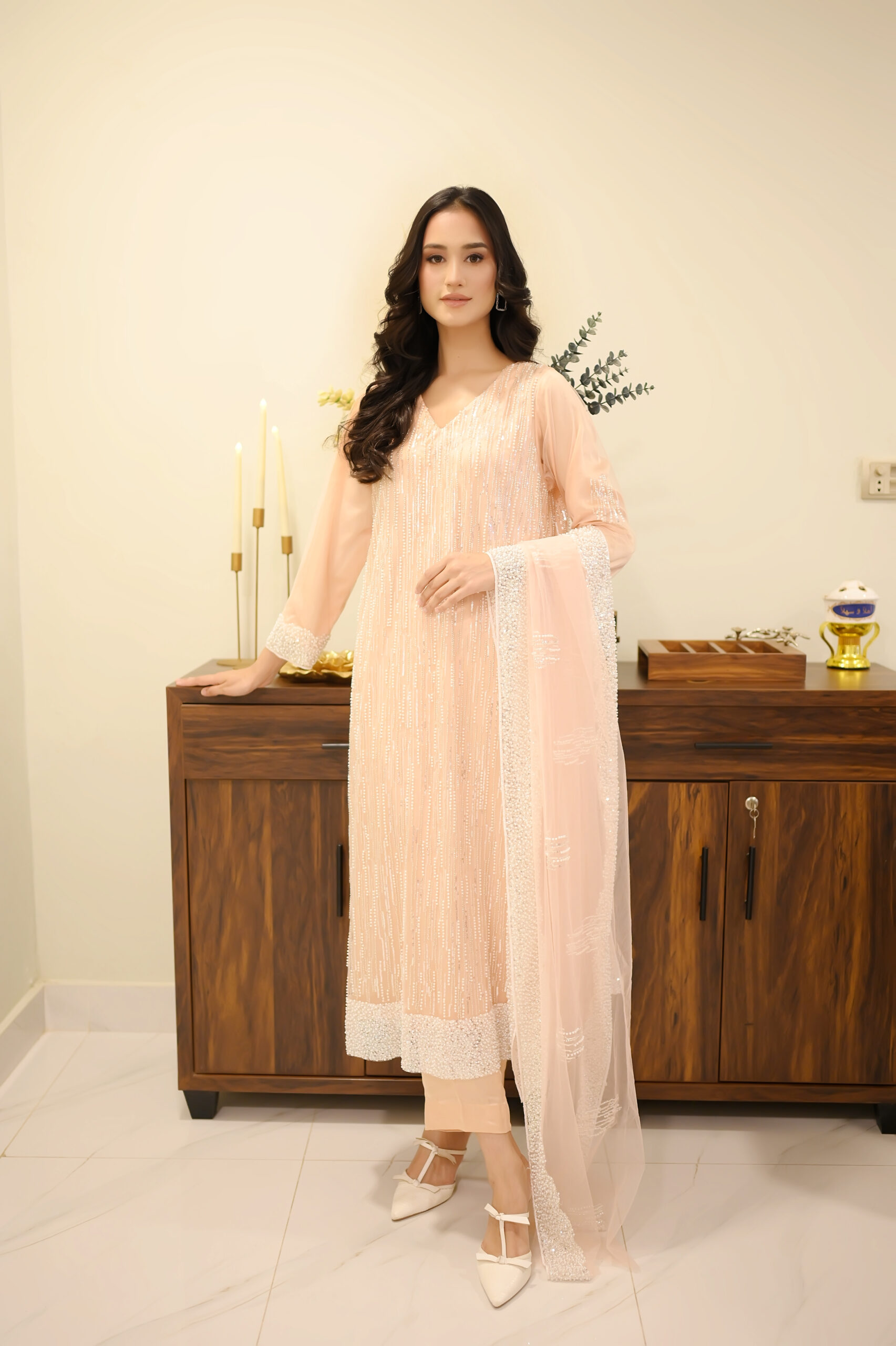 A classic net outfit featuring heavy beadwork, lining, and a matching dupatta. Perfect for weddings, formal events, and grand celebrations across the UK.
