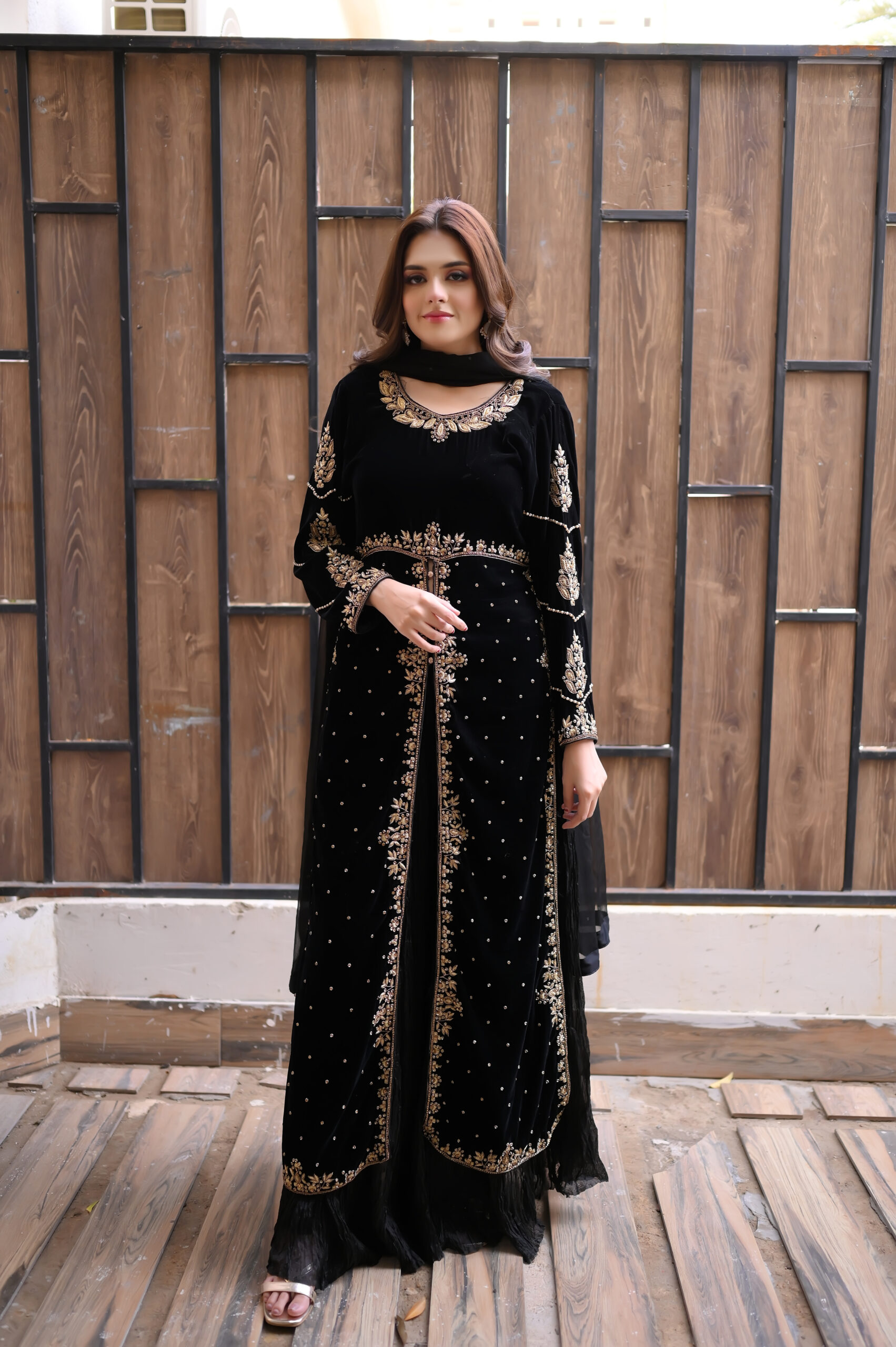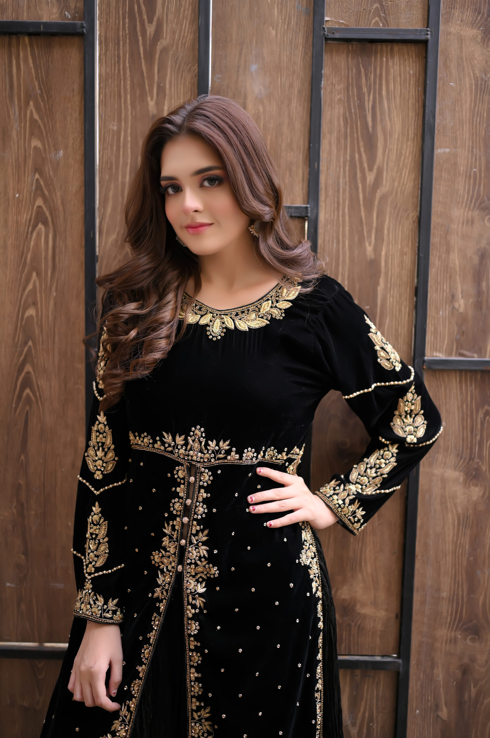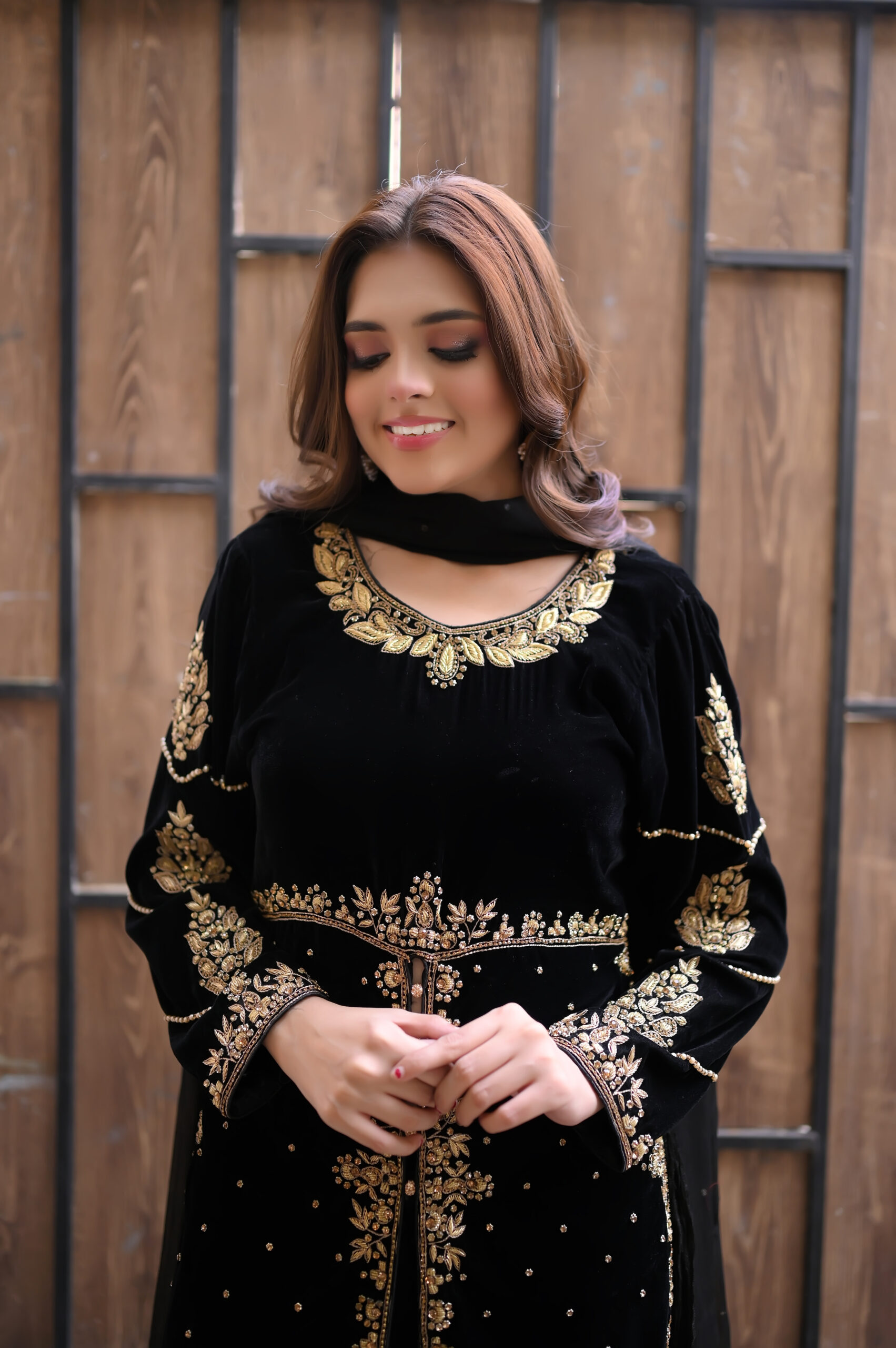 A luxurious black velvet 3-piece suit with gold embroidery and sparkling dupatta. Paired with a crushed gharara, perfect for special occasions and regal celebrations in the UK.