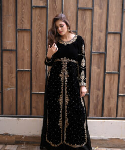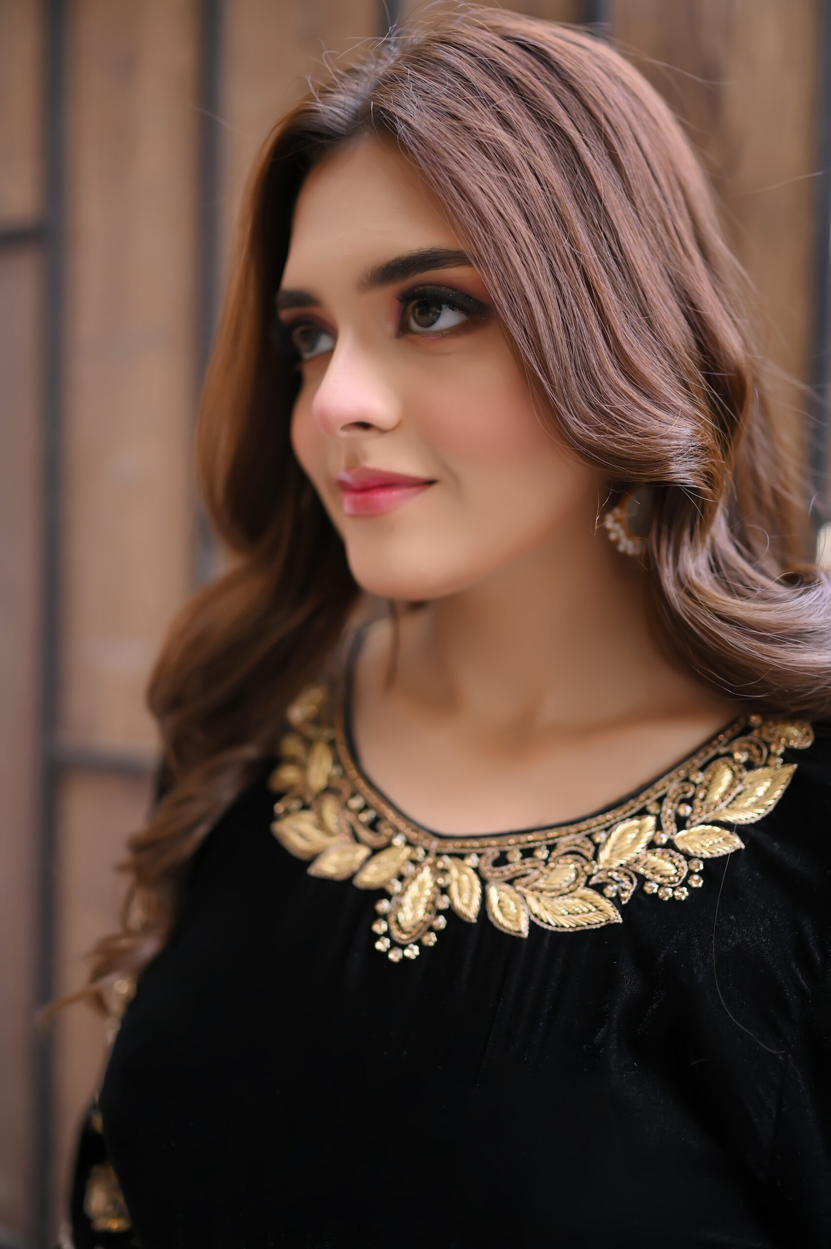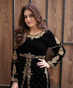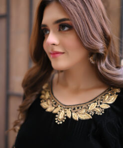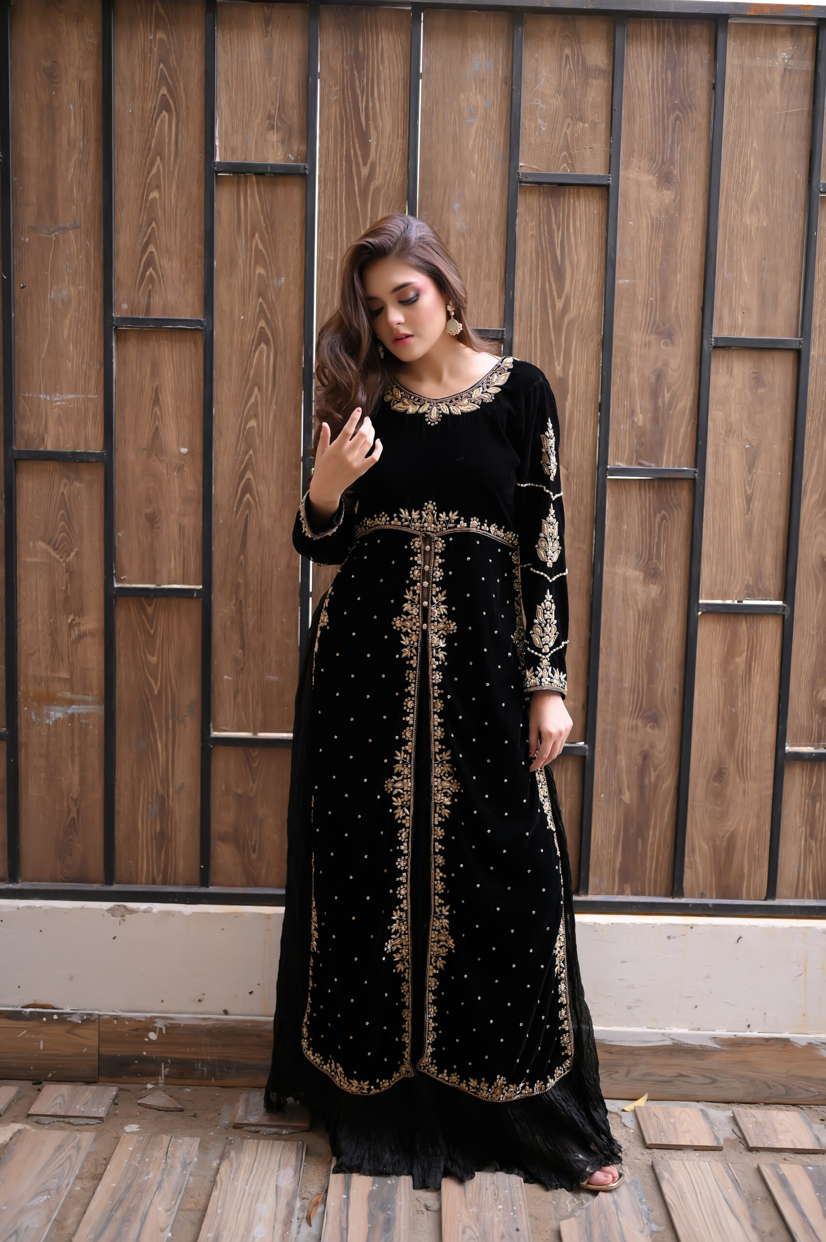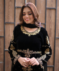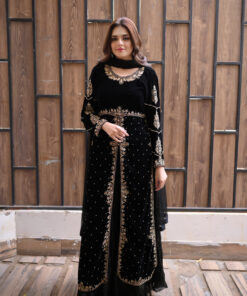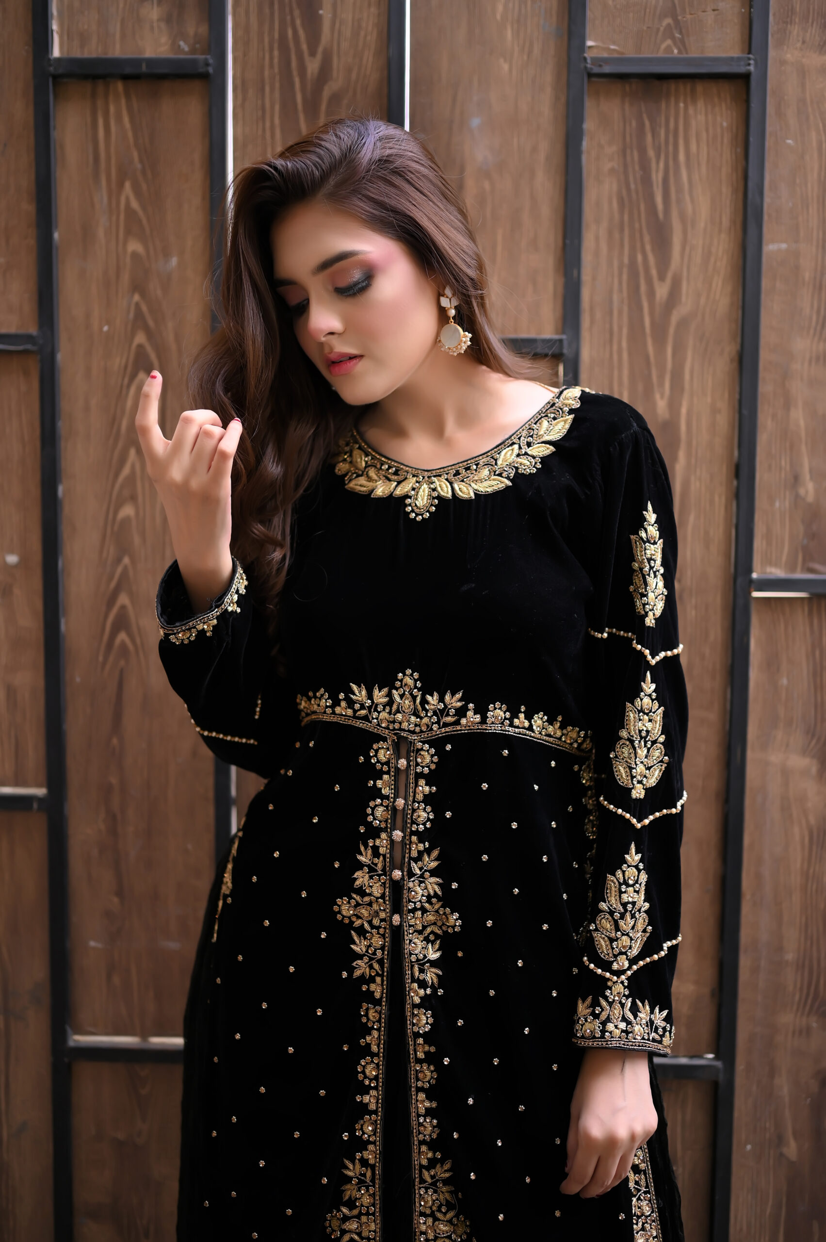 A luxurious black velvet 3-piece suit with gold embroidery and sparkling dupatta. Paired with a crushed gharara, perfect for special occasions and regal celebrations in the UK.