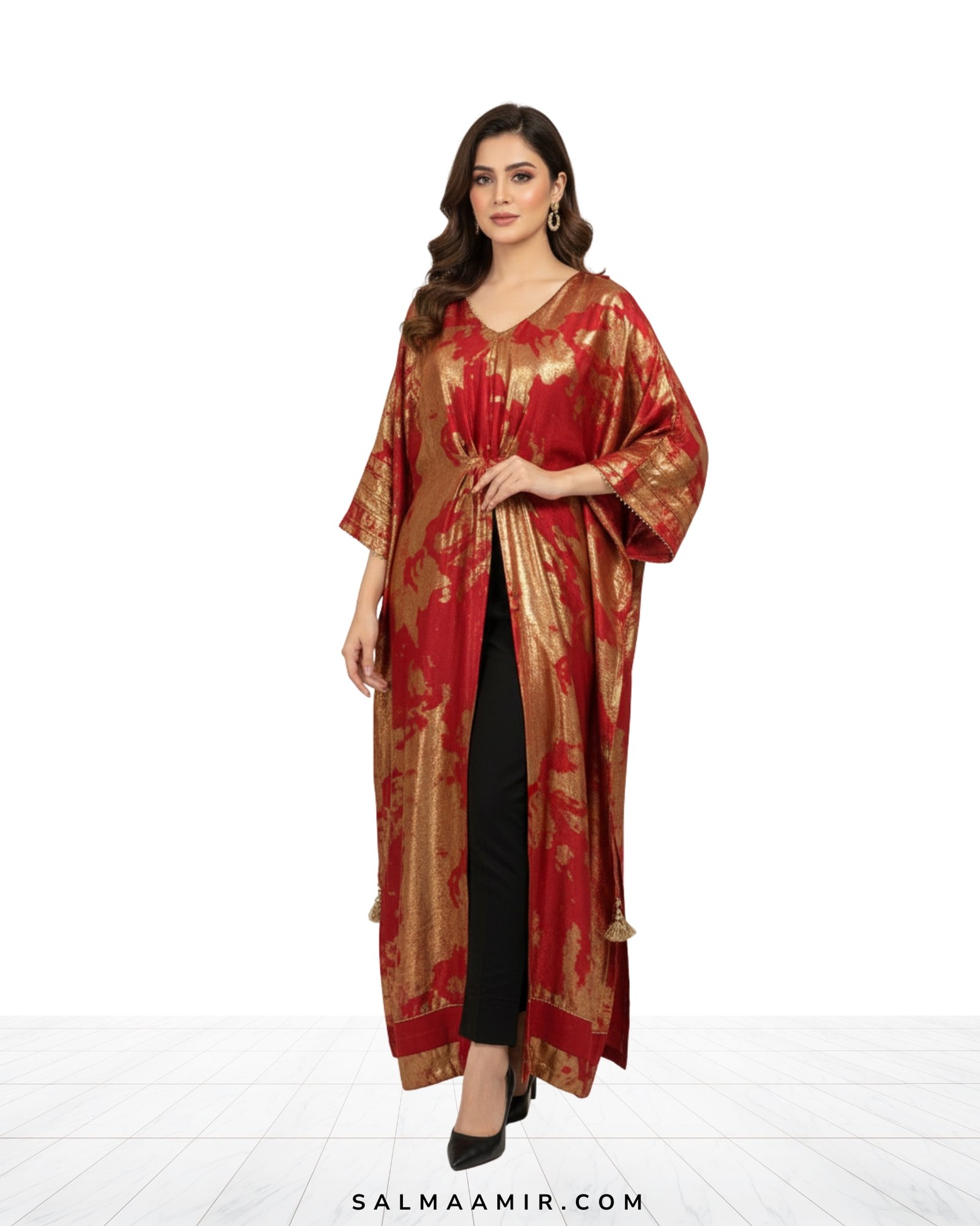 Adorn yourself in the exquisite Noor-e-Shab Kaftan, a signature piece designed for the modern, elegant woman. This luxury kaftan dress features a dramatic black and vibrant metallic gold abstract print that radiates sophistication.