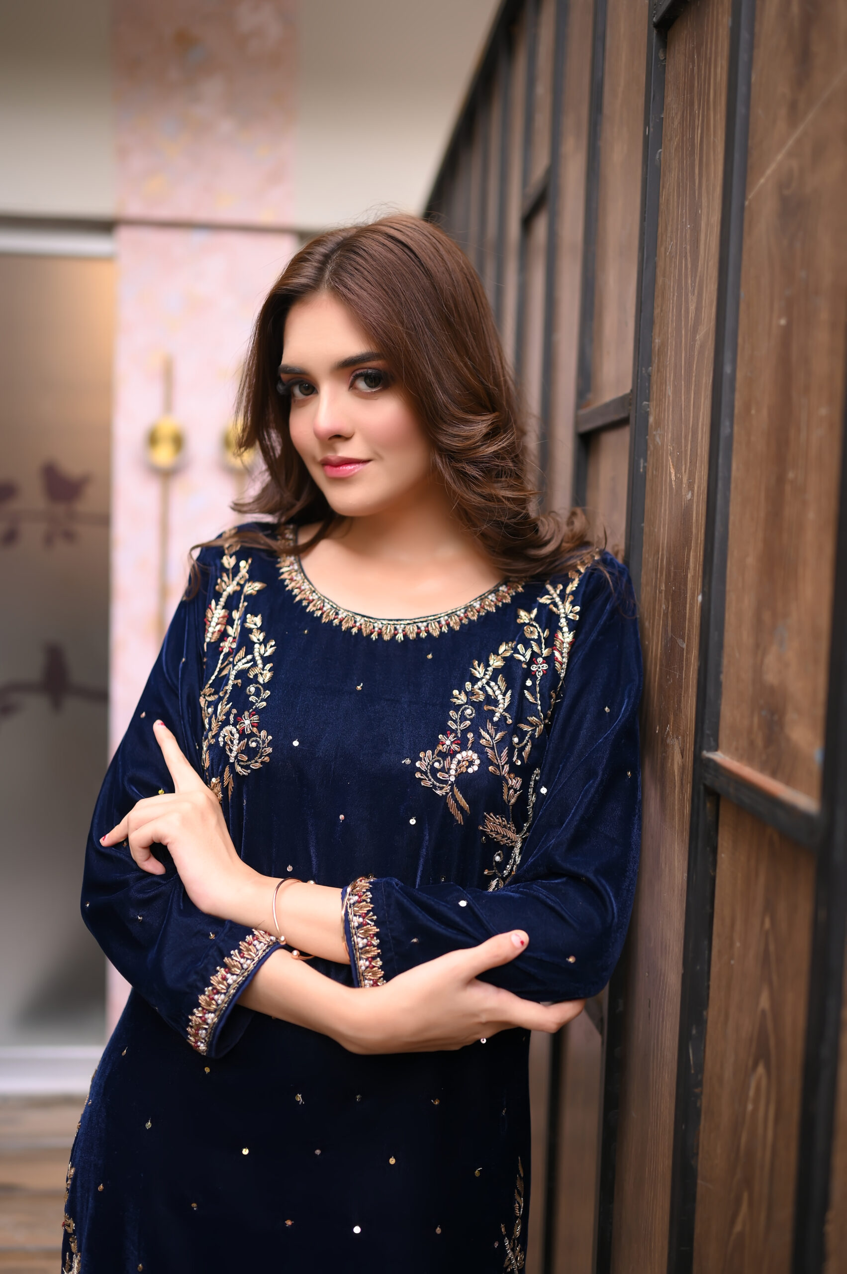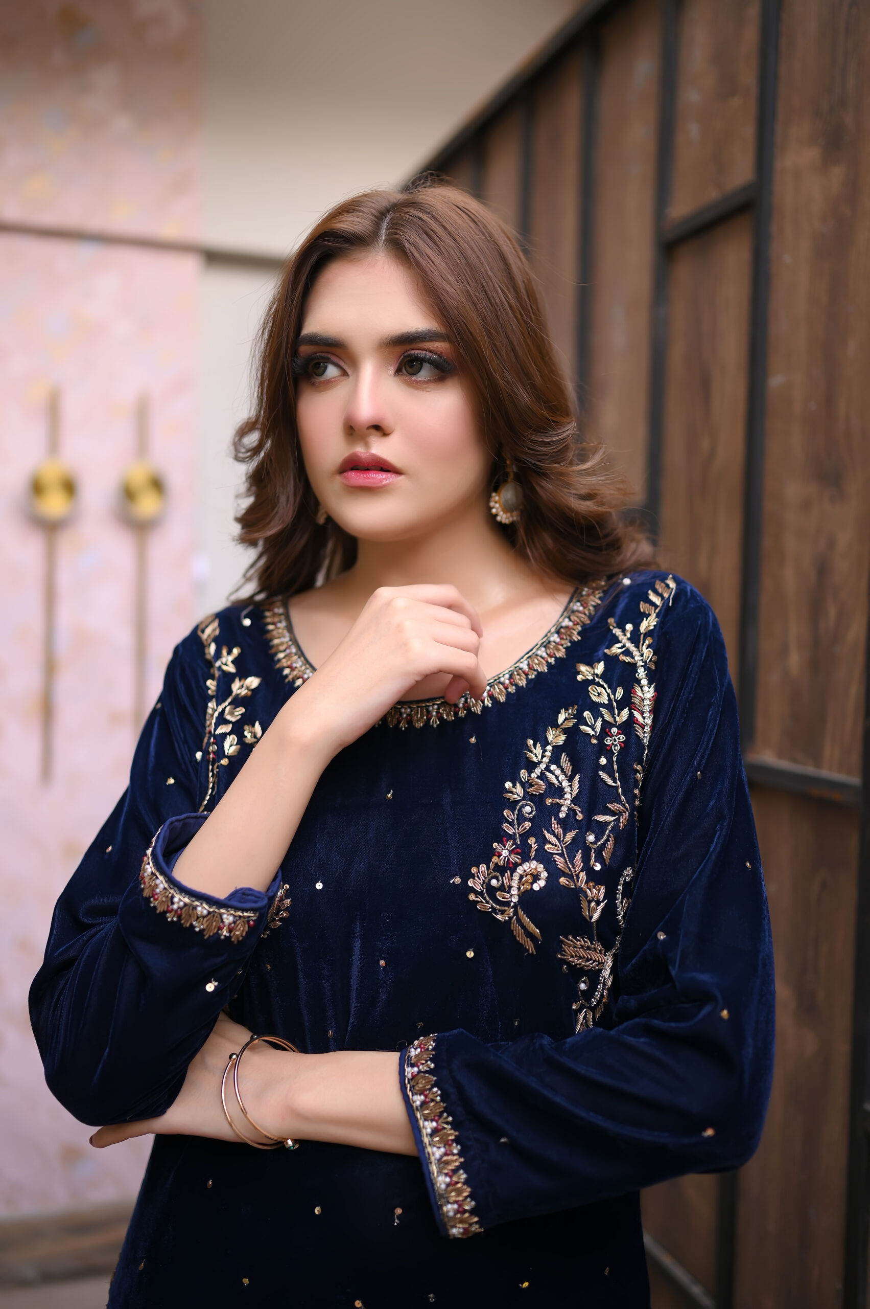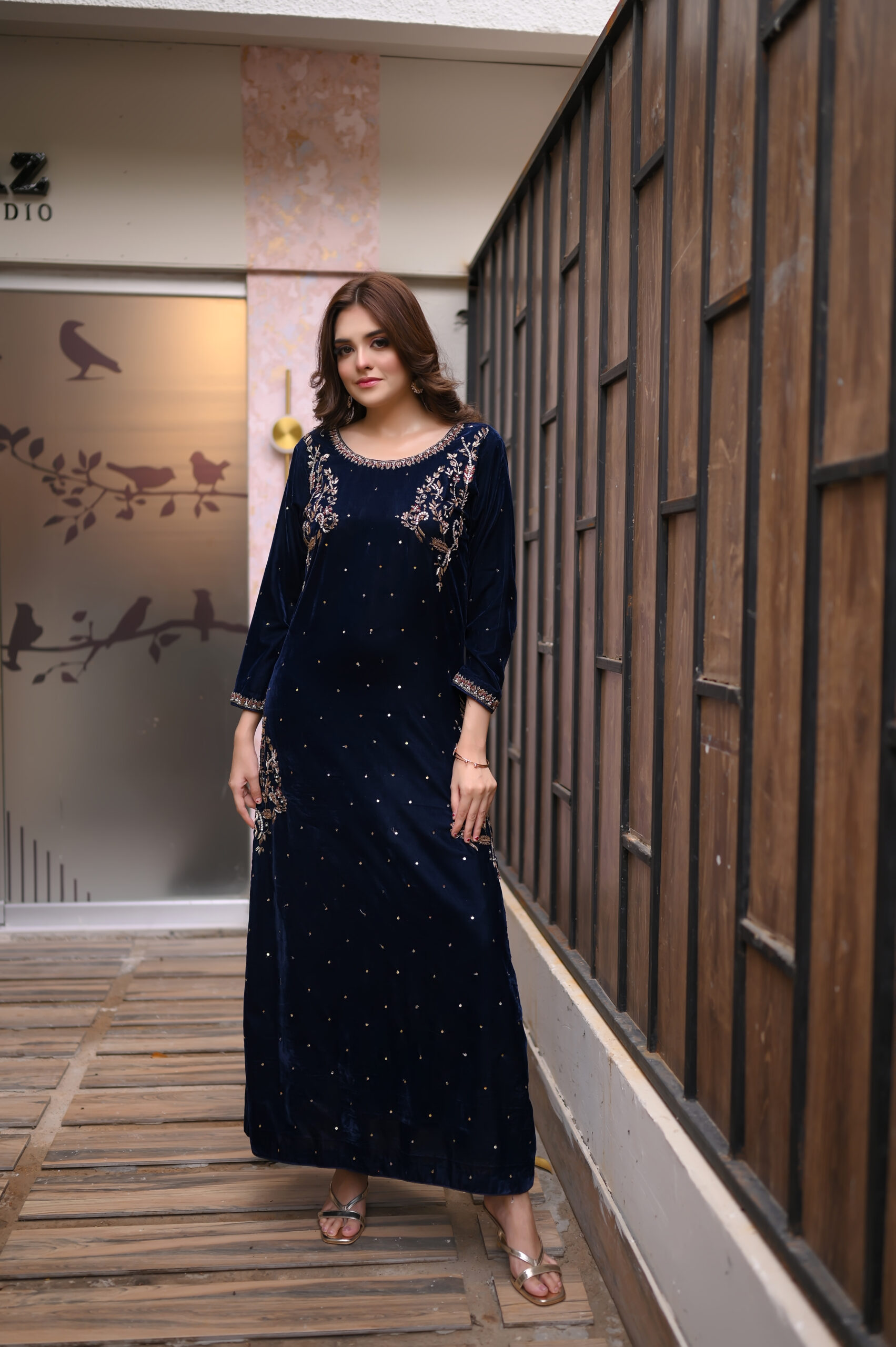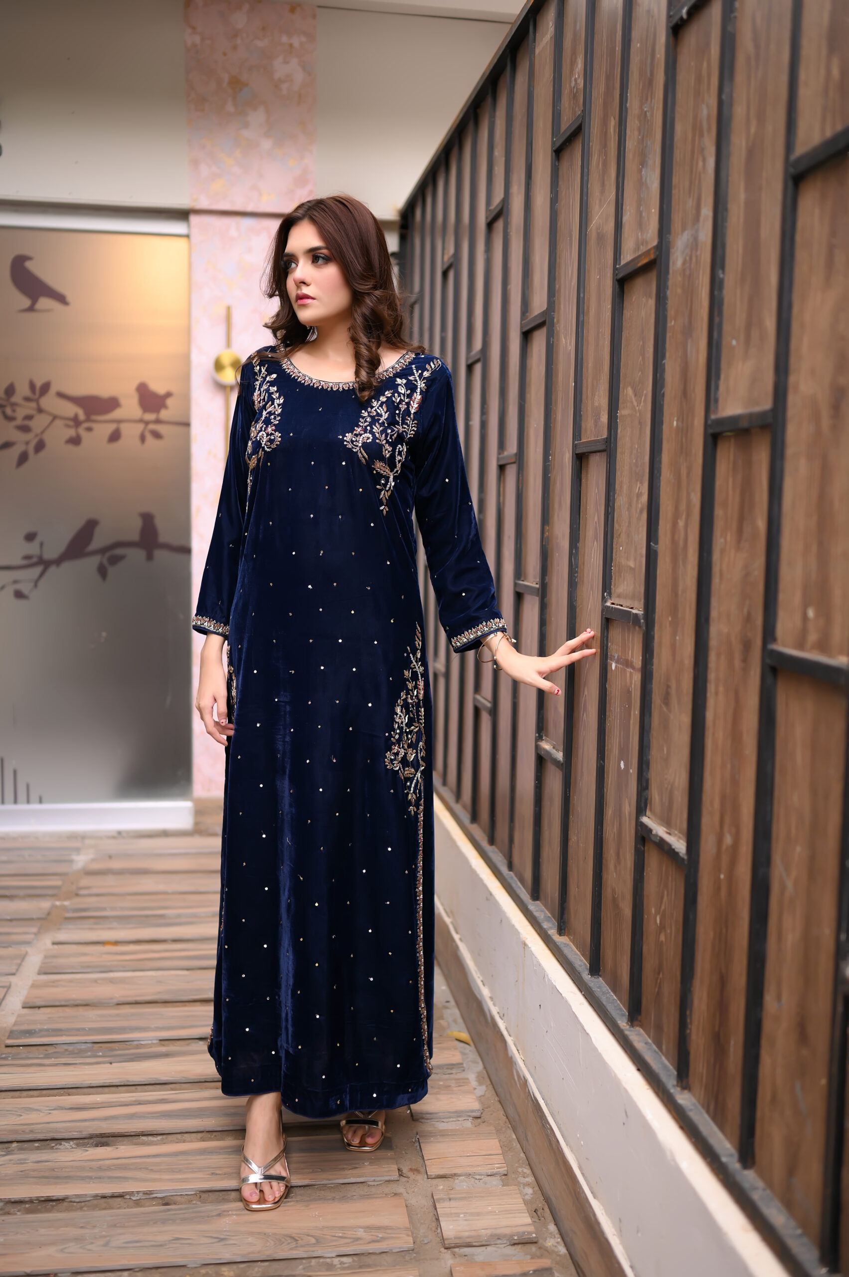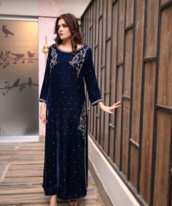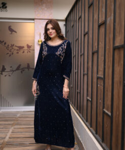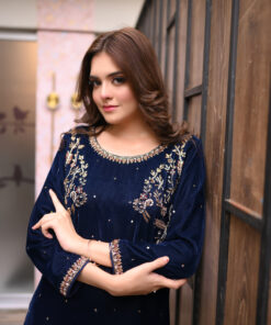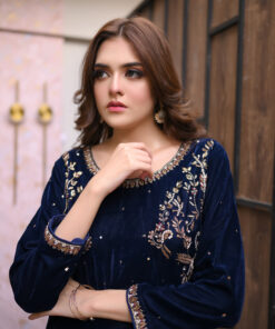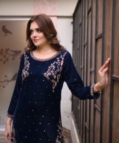 Step into regal sophistication with Regal Navy, a luxurious velvet kameez ensemble designed for the modern woman who loves elegance and tradition.